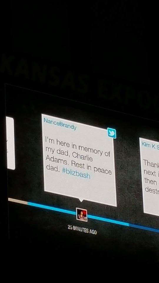 But, it wasn’t the drama of the derby that had me fighting tears. It was the Jumbotron. All around the arena, posters asked people to post selfies and other highlights of their experiences on social media under the #blizbash hashtag. I typed up a status on Twitter and my first status read like this: “Blizzard Bash delivering some drama today.” But then I saw a perfect opportunity to honor my dad. So, my next tweet said this: “I’m here in memory of my dad, Charlie Adams. Rest in peace dad. #blizbash”