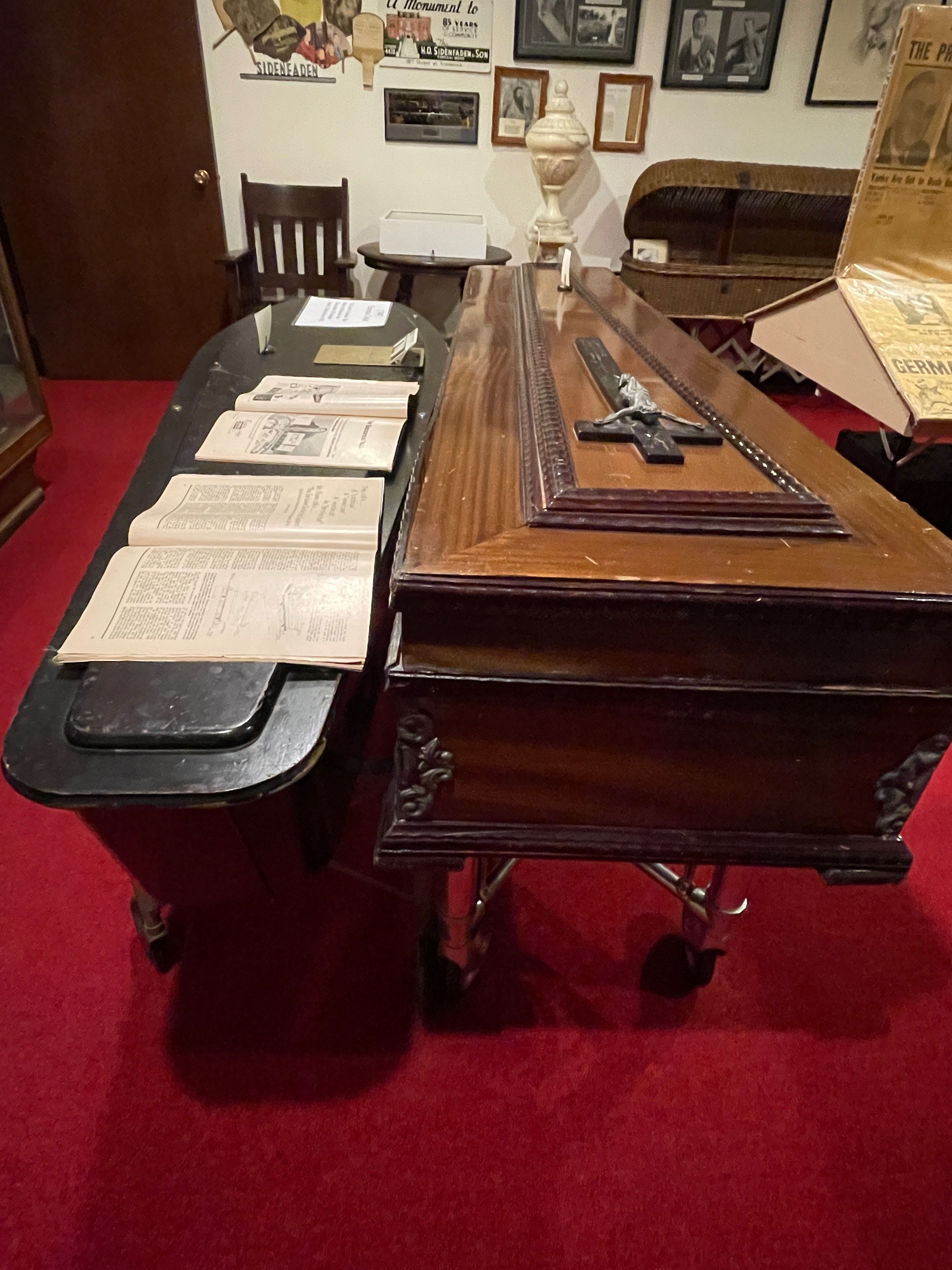 On display in the museum is caskets, historical tools used by morticians and funeral homes, and even a casket that was used to carry Jesse James’ body to the funeral home. Among the caskets is also one that used to hold ice, to preserve the body that had to be shipped. You’ll also find historical photos, articles, books and lots of surprise finds as you peek in every nook and cranny of the museum. And make sure you do peek in every nook and cranny because they’ve packed a lot in this museum.